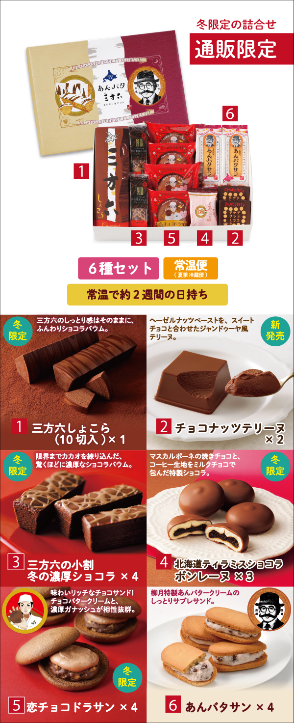 冬限定の「三方六 しょこら」や、新発売の「チョコナッツテリーヌ」などバラエティ豊かにお詰めしました。