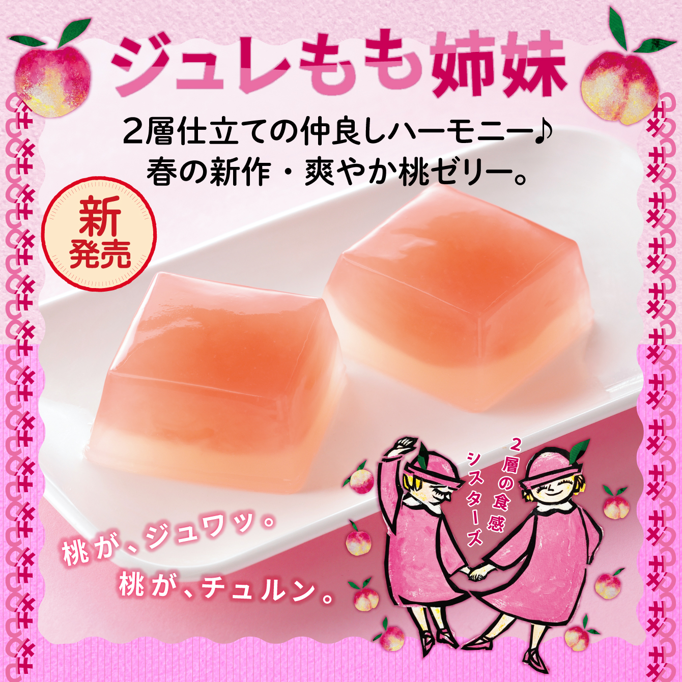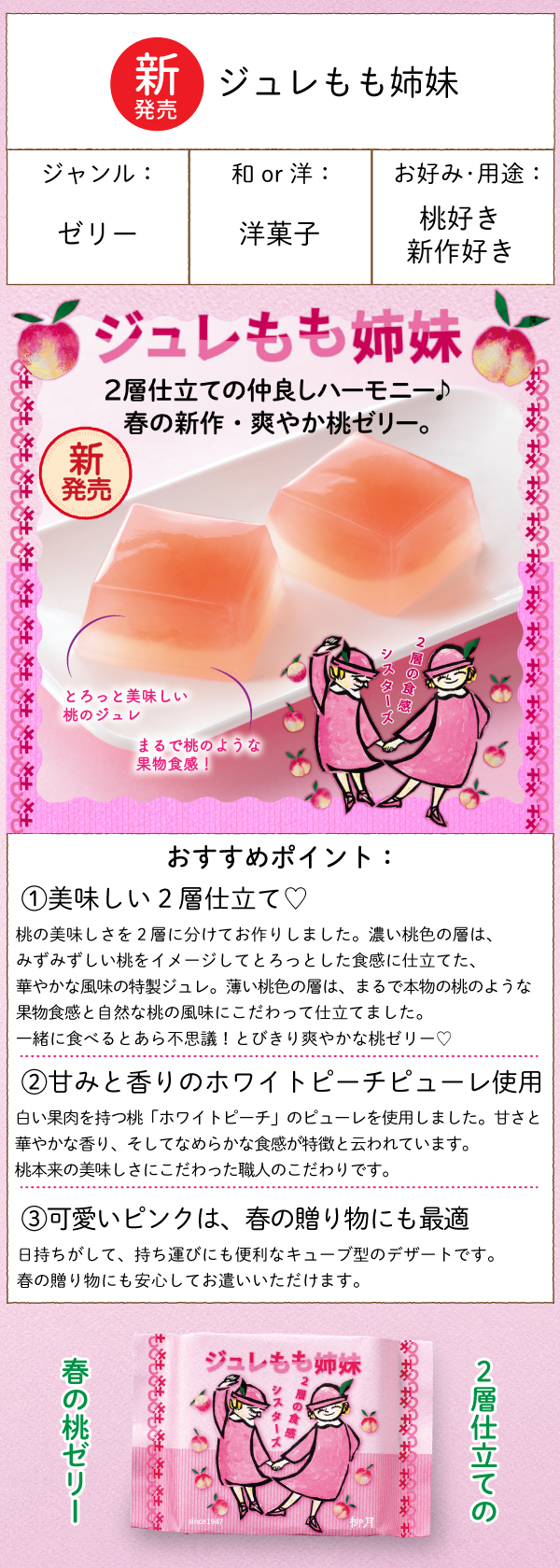 透明層は桃の果肉食感をイメージ、濃いピンク層はとろとろジューシー食感です。