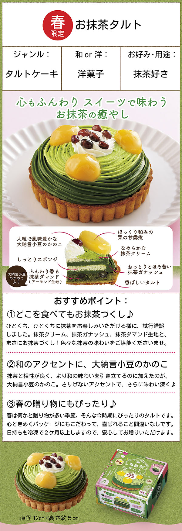 抹茶クリーム、抹茶ガナッシュ、抹茶ダマンドで、どこから食べても、お抹茶三昧に仕立てました。