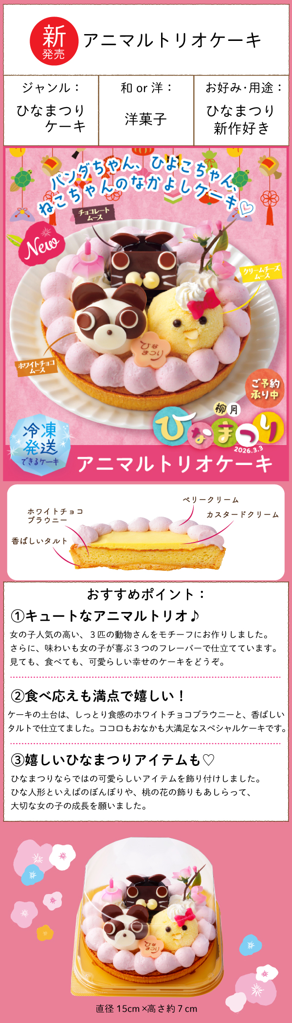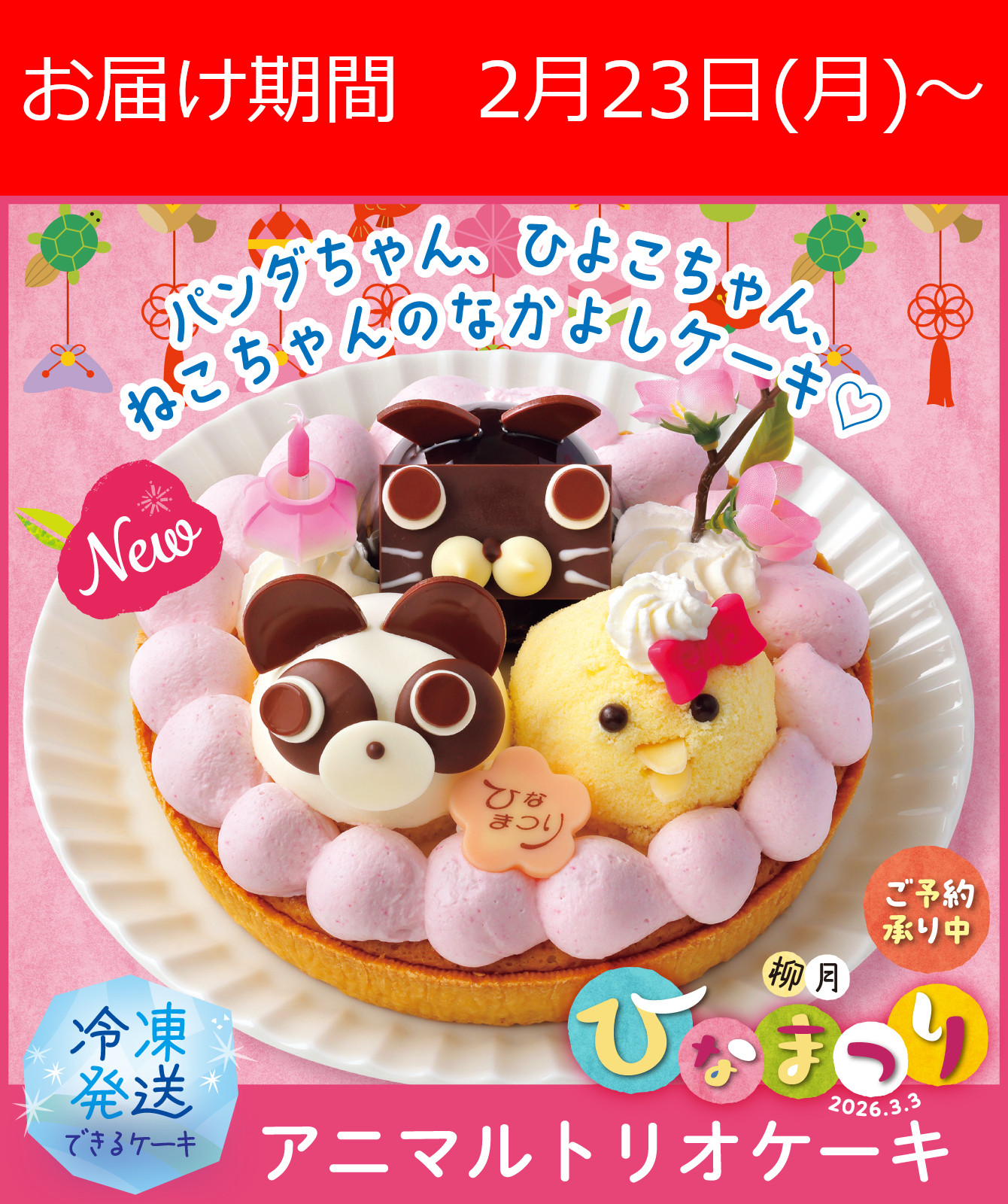 ひなまつりパーティーをにぎやかに彩るパンダちゃん、ひよこちゃん、ねこちゃんのトリオケーキ。